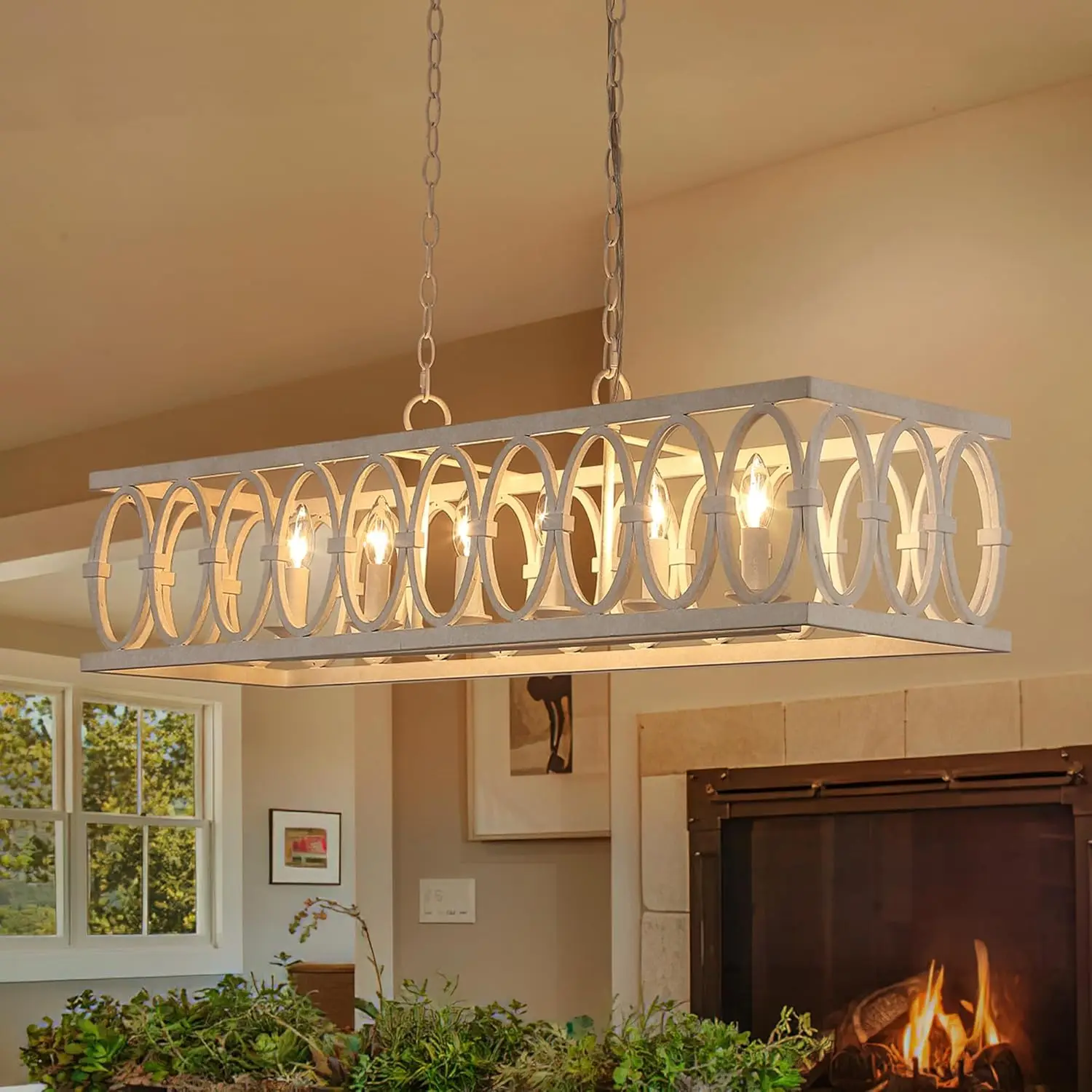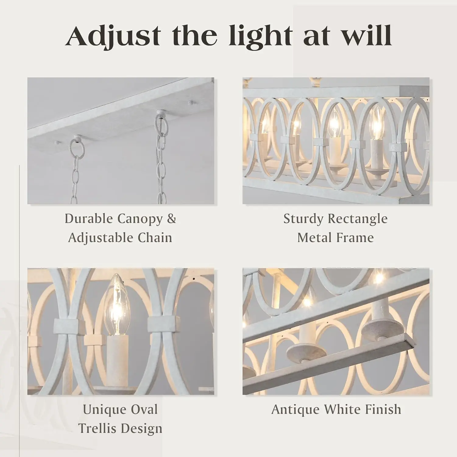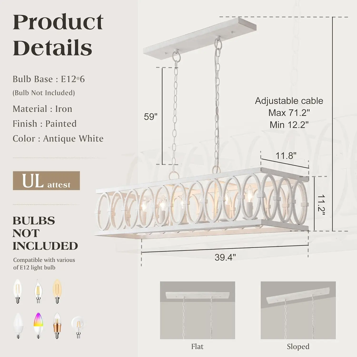 Modern White 6-Light Chandelier Light L39.4 Rustic Farmhouse Rectangle Pendant Lamp for Dining Room Kitchen